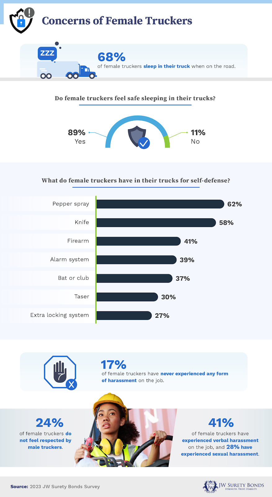 - Female truckers felt safest when they had a bat or club in their car (74% reported feeling safe), followed by pepper spray (72%).