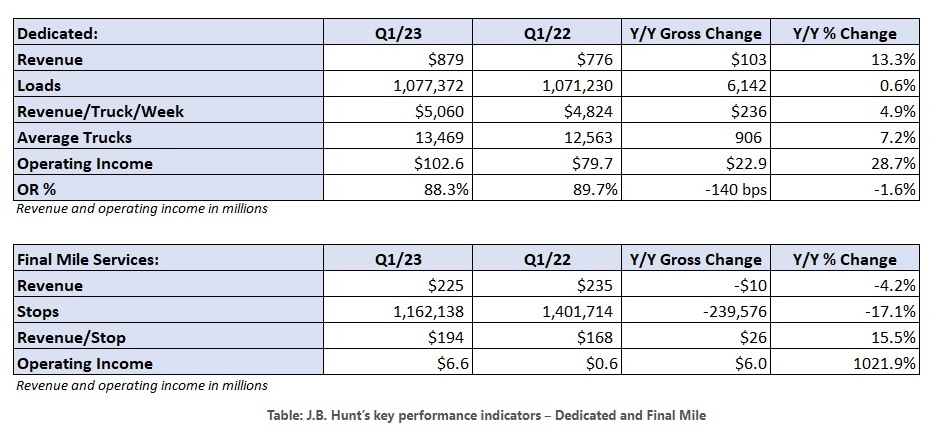 J.B. Hunt’s intermodal loadings decreased by 5% year-over-year during the period, which was a better result than the overall intermodal traffic decline of 10% on the U.S. Class I railroads, according to data from the Association of American Railroads.