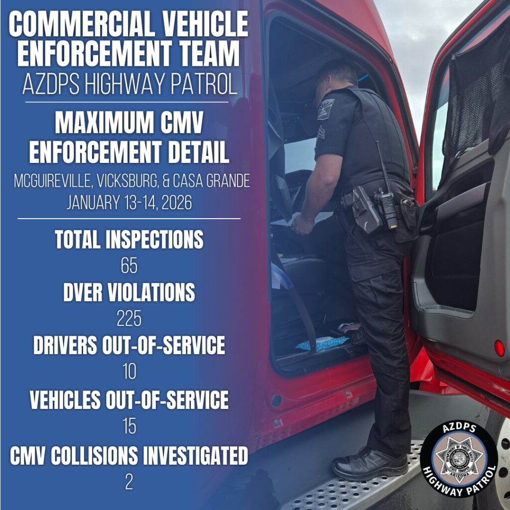 Arizona Highway Patrol state troopers assigned to the Commercial Vehicle Enforcement Unit conducted three targeted commercial vehicle enforcement details at the McGuireville rest area, Vicksburg, and Casa Grande. The operations focused on identifying hazardous violations known to contribute to collisions.