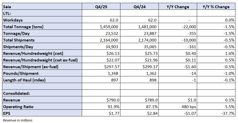 Saia reported fourth-quarter earnings per share of $1.77 on Tuesday before the market opened, down 38% year over year and 14 cents below consensus estimates. Results included $4.7 million in adverse claims developments during the quarter. Excluding those costs, adjusted EPS would have been $1.91, in line with expectations.